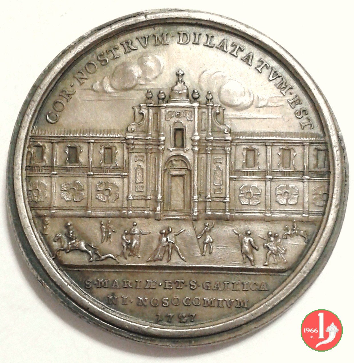 A. IV -Ospedale e chiesa S. Gallicano -M219 Dritto: BENED • XIII • _ P • M • A • IV • busto benedicente a sx con camauro, mozzetta e stola davanti alla mano: H Prospetto anterio dell'Ospedale di S. gallicano in esergo: S • MARIAE • ET • S • GALLICA = NI • NOSOCOMIVM = 1727 | |