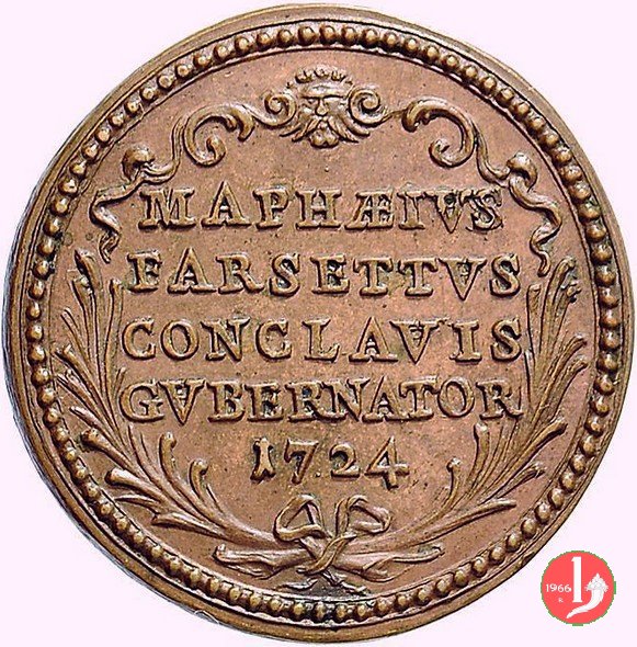 Verso: tra due rami legati in basso: fregio = MAPHAEIVS = FARSETTVS = CONCLAVIS = GVBERNATOR = 1724
