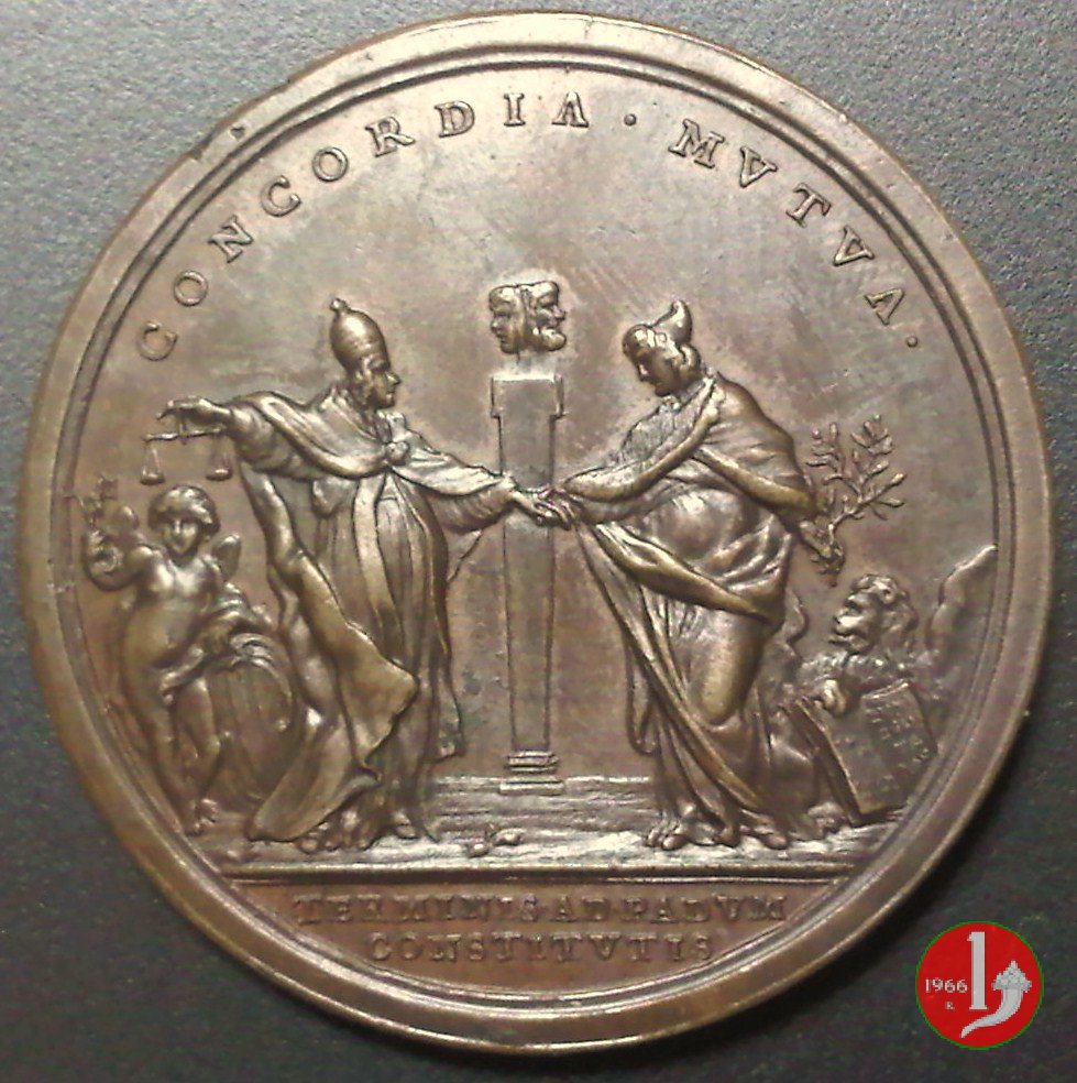 A. XIII -Confini con la Repubblica Veneta -P74 Dritto: BENED • XIV _ PONT • MAX • AN • XIII busto a dx con camauro, mozzetta e stola sul taglio spalla: O • HAMERANI Le figure allegoriche della Chiesa, con triregno e piviale, regge bilancia e la Repubblica Veneta, con corno Dogale, regge ramo d'ulivo, in piedi si stringono la mano davanti ad una stele, ai lati: a sx putto regge Stemma Papale e chiavi, a sx il leone di S. Marco regge il Vangelo in esergo: TERMINIS • AD • PABVM = CONSTITVTIS |