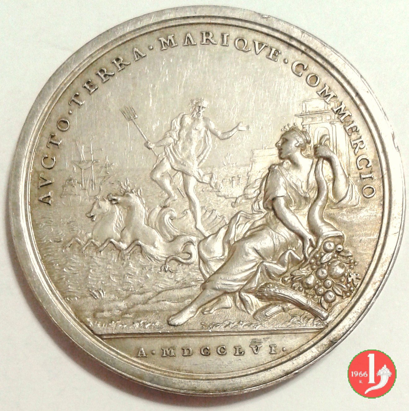 Prosperità del Commercio -P84 Dritto: BENED • XIV • _ PONT • MAX • A • XVI Busto con mozzetta es tola a dx sotto: O • HAMERARI • Nettuno con tridente, su carrao a conchiglia trainato da cavalli marini, và a facilitare la navigazione delle imbarcazioni, a dx a terra la figura allegorica dell'abbondanza con cornucopia in esergo: MDCCLVI • | |