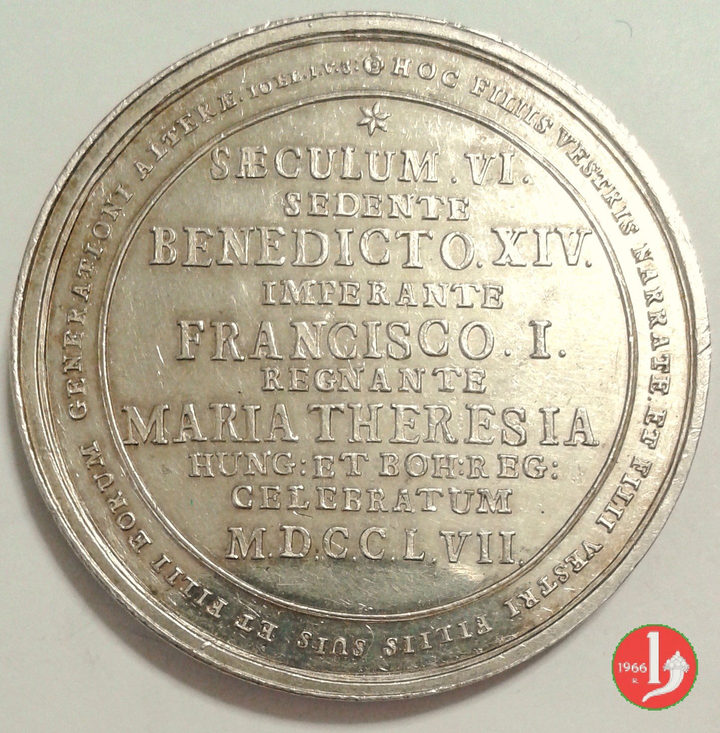 nel campo: SAECULUM.VI. = SEDENTE = BENEDICTO.XIV. = IMPERANTI = FRANCISCO I = REGNANTE = MARIA THERESIA = •.. = M.D.C.C.L.VII