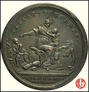 Beneficenza Pontificia -P3 Dritto: CLEMENS _ XIV • PONT • M • A • I • busto a dx con camauro, mozzetta e stola Allegoria della Beneficenza pontificia allatta, a dx una sirena con frutti di mare in esergo: VECTIGALIA • REMISSA = MDCCXIX | |