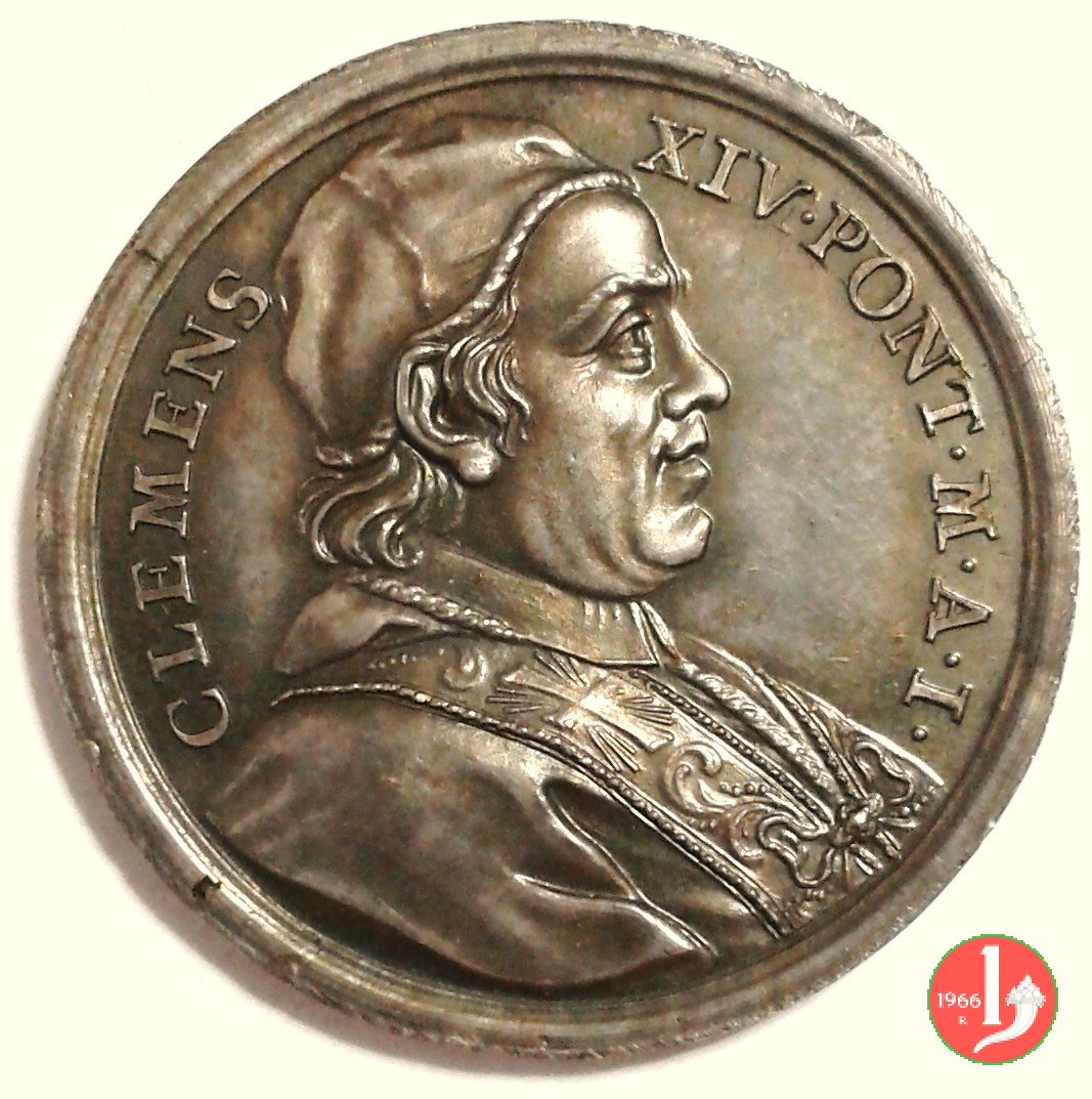 Lavanda dei piedi A. I -P4 Dritto: CLEMENS _ XIV • PONT • M • AN • I • • busto a dx con camauro, mozzetta e stola Gesú, chino verso sx, lava i piedi a S. Pietro in esergo: EXEMPL • DED = • VOBIS • |