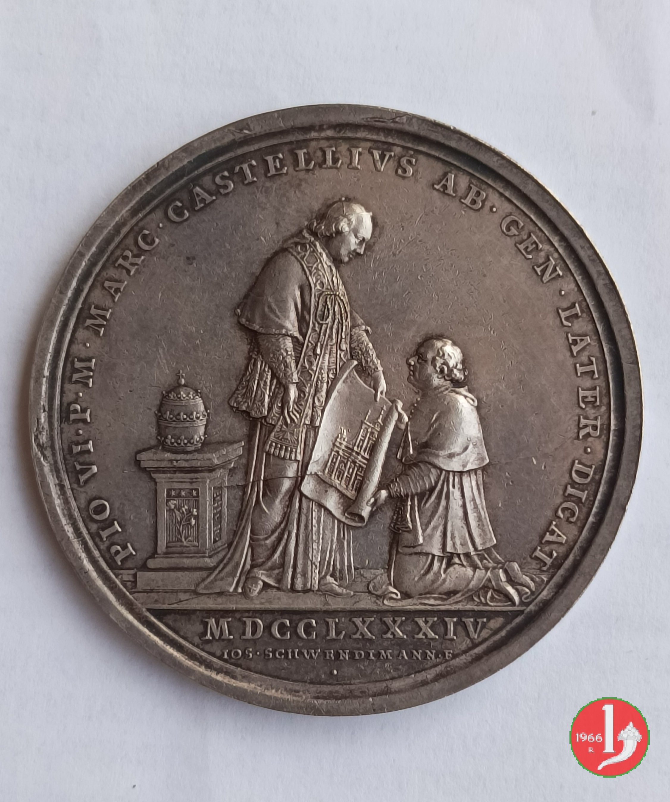 Basilica S. Maria Portuense Ravenna -P52 Dritto: PIO VI • P • M • MARC • CASTELLIVS AB • GEN • LATER • DICAT • Il Papa in piedi volto a dx riceve, dall'Abate Marco Castelli genuflesso, il progetto della nuova Basilica di Ravenna, dietro basamento reca lo stemma papale e il triregno in esergo: MDCCLXXXIV = IOS • SCHWENDIMANN F. in esergo:FRONS BASIL • S • MAR • = PORTVEN • RAVEN = • | |