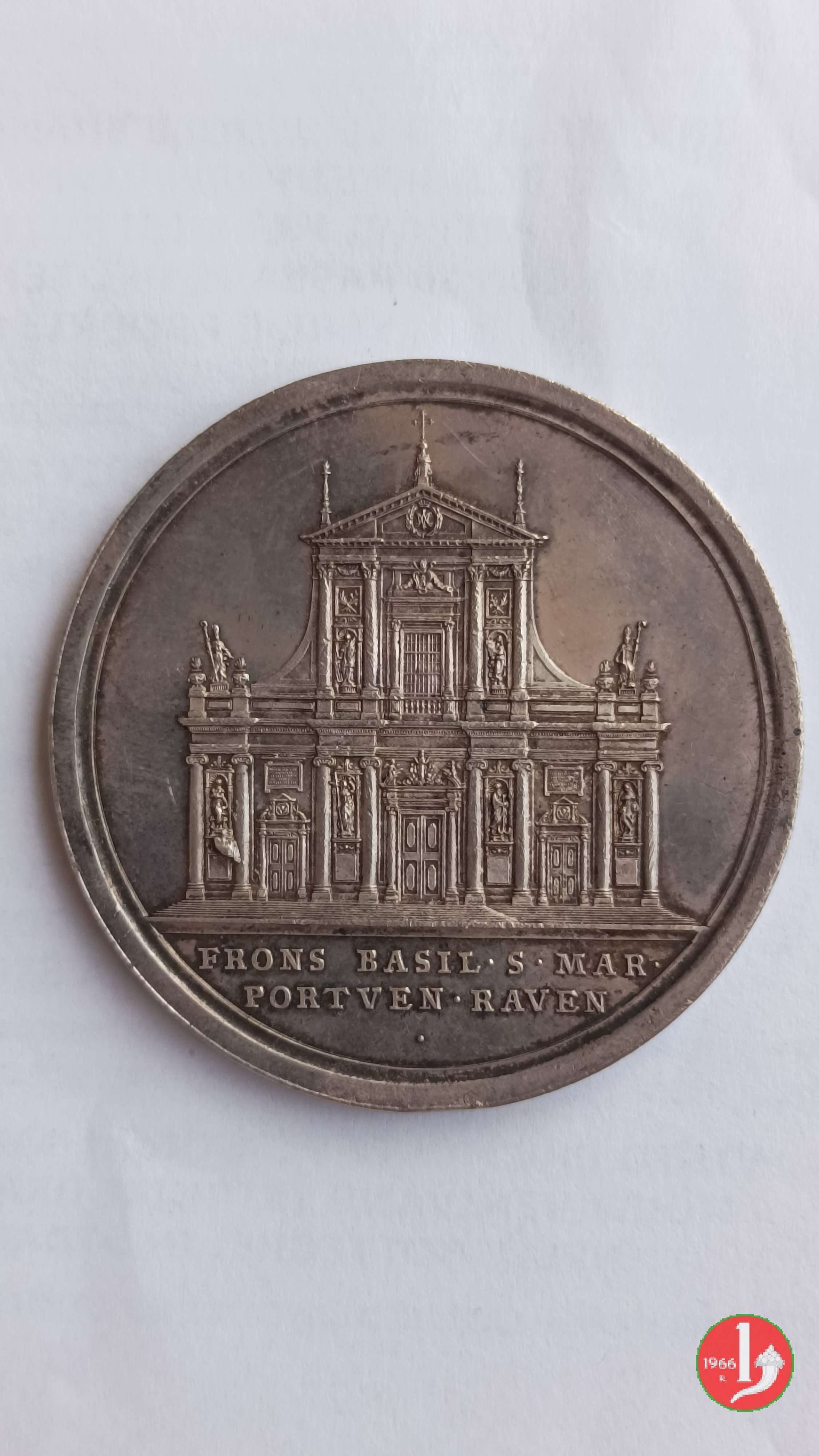 Basilica S. Maria Portuense Ravenna -P50 Dritto: PIO VI - P • M • MARC • CASTELLIVS AB • GEN • LATER • DICAT • Il Papa in piedi volto a dx riceve, dall'Abate Marco Castelli genuflesso, il progetto della nuova Basilica di Ravenna, dietro basamento reca lo stemma papale e il triregno in esergo: MDCCLXXXIV = IOS • SCHWENDIMANN F. | |