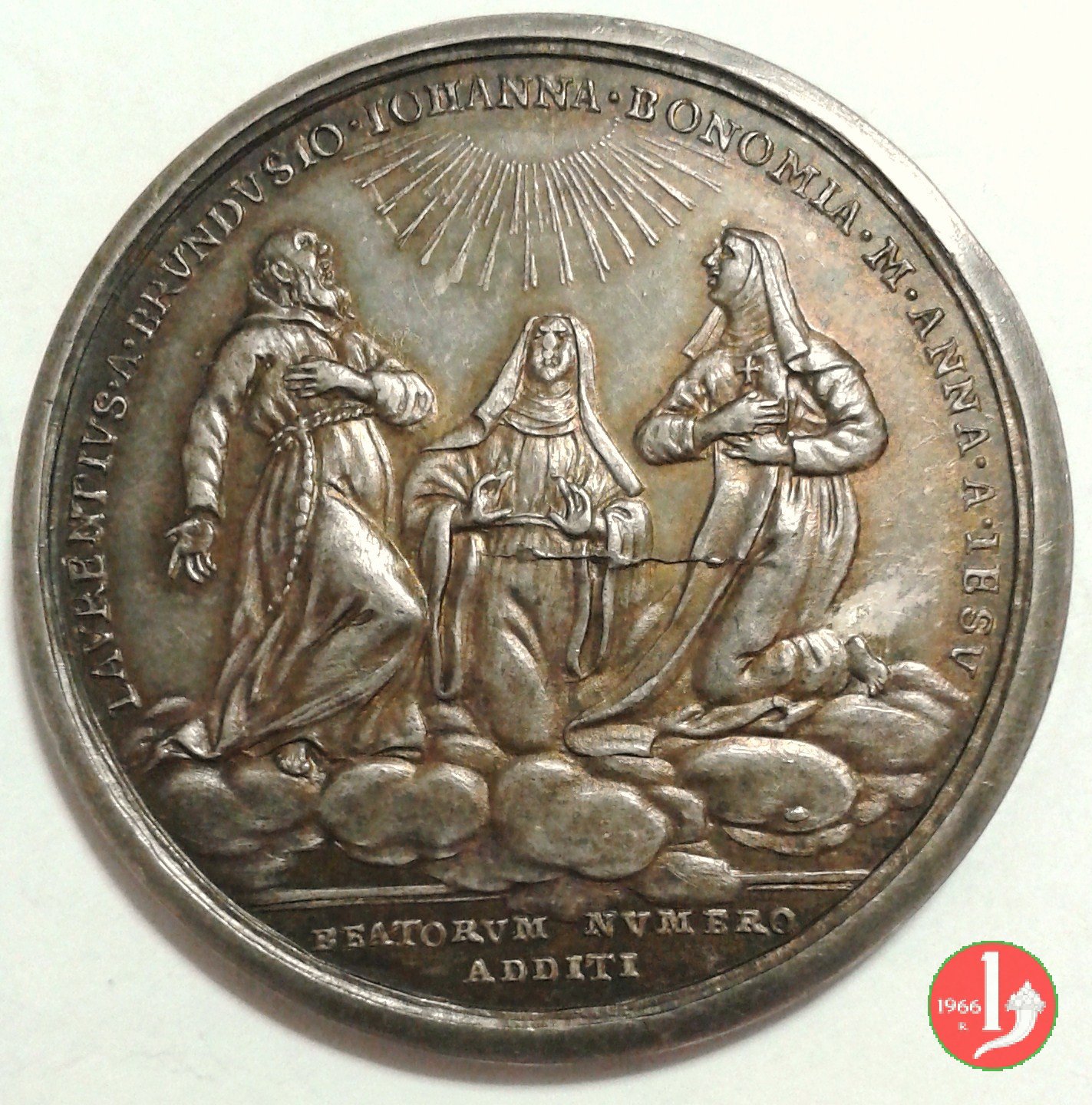 A. X -Canonizzazione di tre Santi -P53 Dritto: PIVS * SEXTVS _ PONT * MAX * A * X * busto a dx con berretto, mozzetta e stola Tre nuovi Santi sulle nubi irraggiati dalla luce divina in esergo: BEATORVM NVMERO = ADDITI |