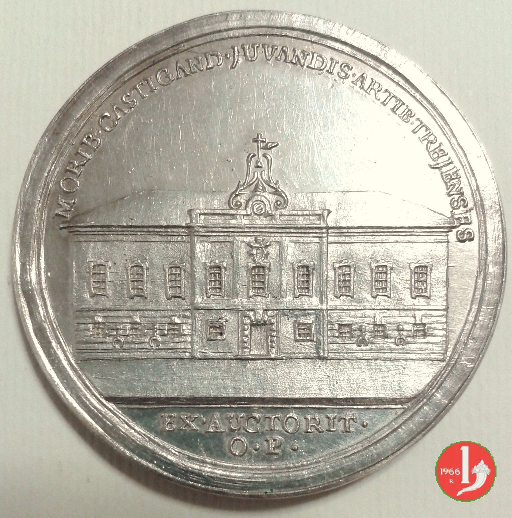 A. XII -Nuovo Carcere di Treja -P57 Dritto: PIVS • SEXTVS _ PONT • MAX • A • XII busto a dx con berretto, mozzetta e stola Prospetto anteriore del nuovo carcere. in esergo: EX • AUCTORIT • = O • P • | |