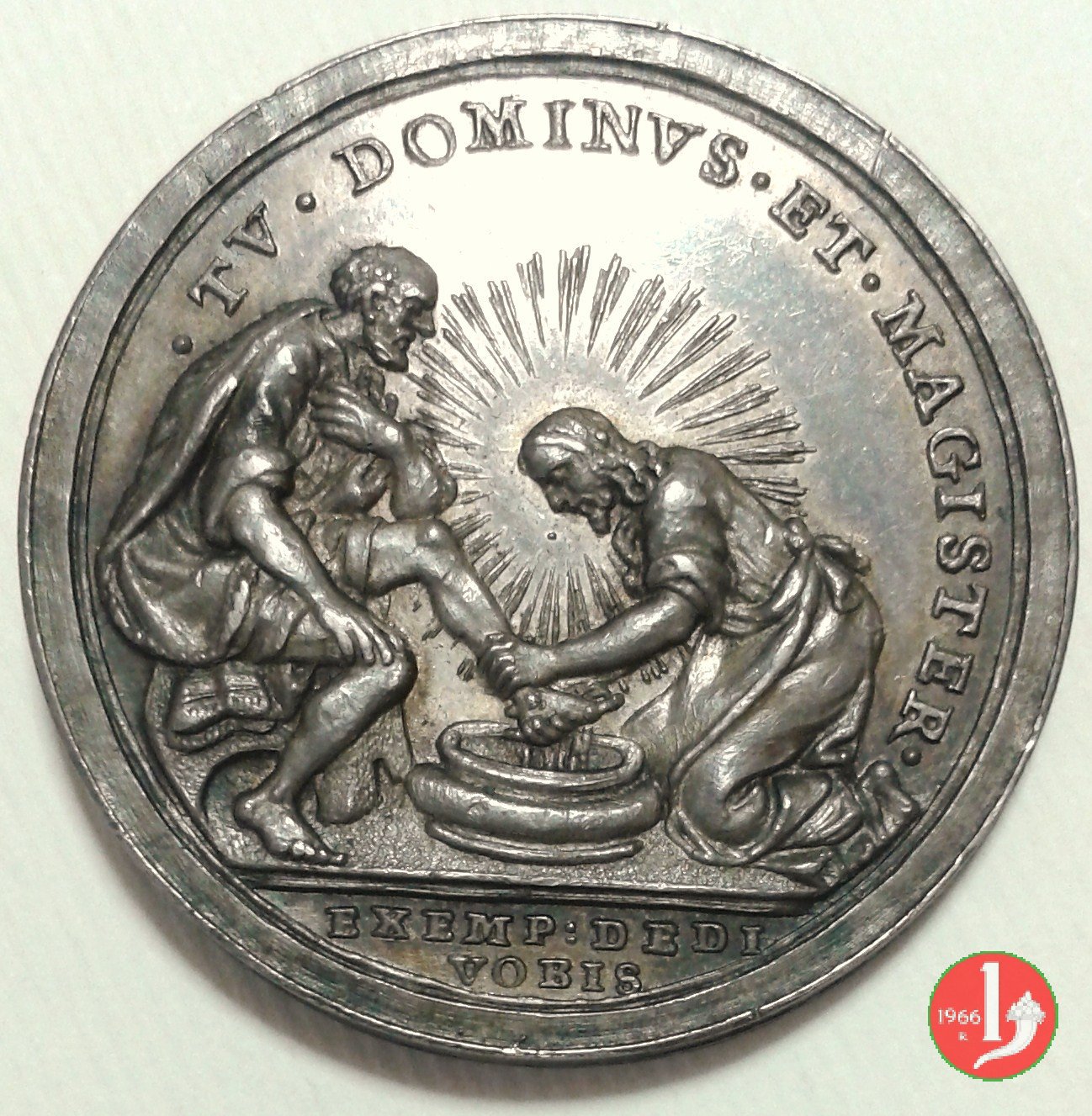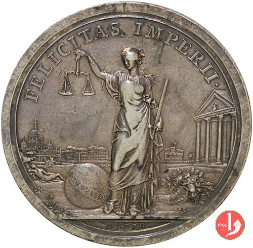 La giustizia in piedi, di fronte, regge bilancia e spada, sotto globo con fascia iscritta: UNUS PASTOR e cornucopia, sullo sfondo S. Pietro con i Palazzi Apostolici, Castel Sant'Angelo e sulla dx il Pantheon