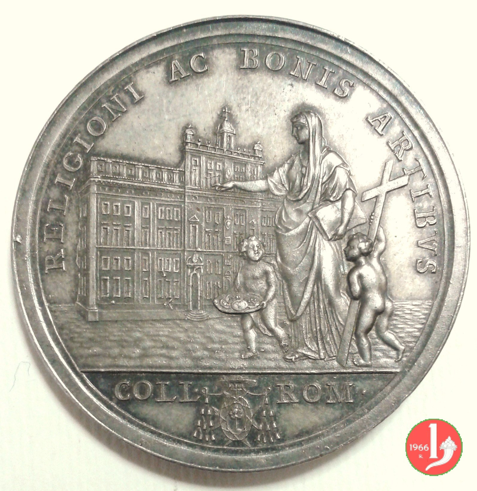 La Religione in piedi a sx, addita con la mano dx due geni nudi recanti croce e e piatto con oggetti, sullo sfondo il Collegio Romano