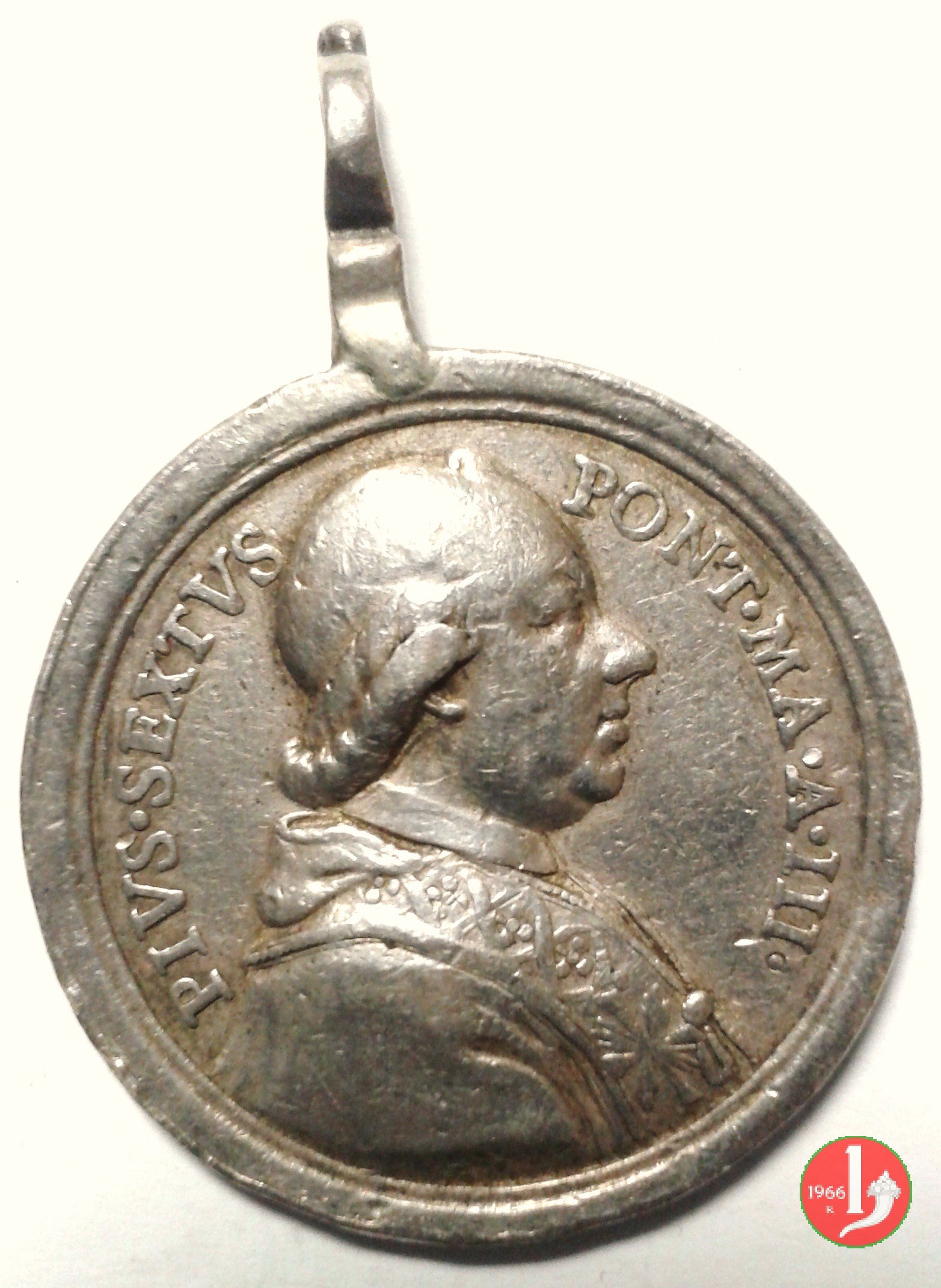 A. III -San Lorenzo alle grotte -P22 Obverse: PIVS • SEXTVS _ PONT • MAX • A • III • busto a dx con berretto, mozzetta e stola Veduta, a volo d'uccello, della Piazza ottagonale di San Lorenzo nuovo presso il Lago di Bolsena in esergo: OPP • S • LAVR • IN • SAL • = LOCVM • TRANSL = 1777 | |