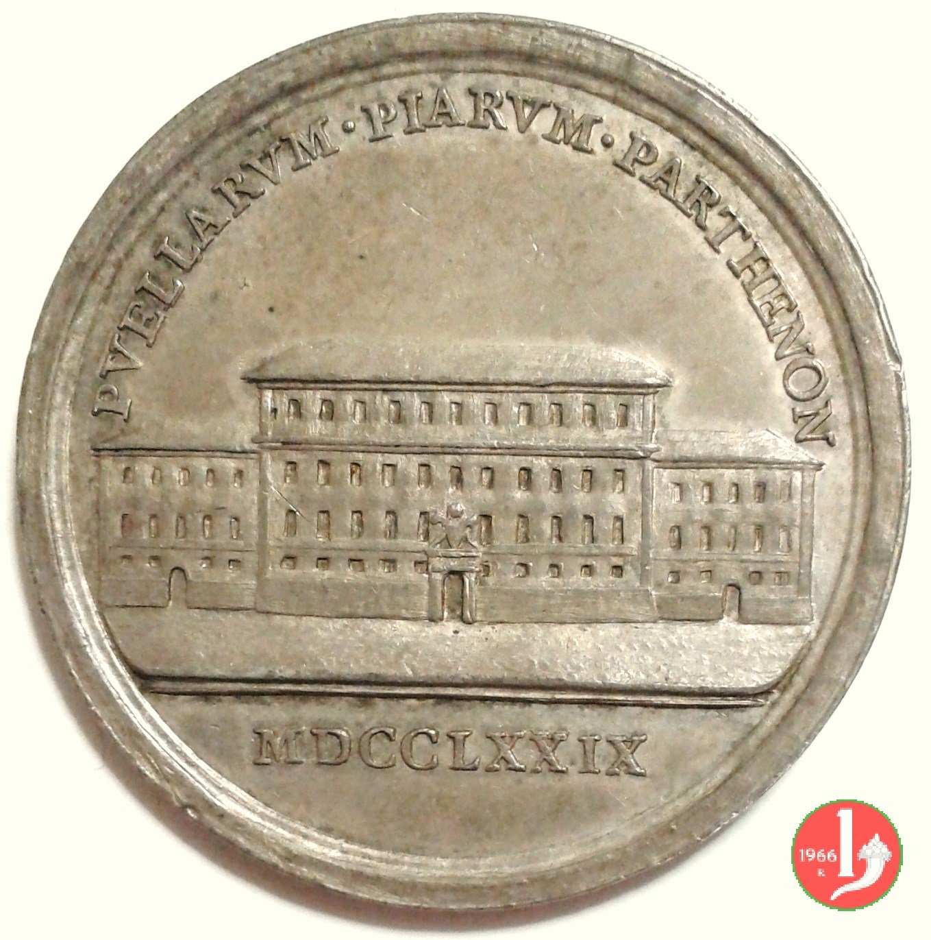 A. V -Conservatorio Pio in Montorio -P30 Dritto: PIVS * SEXTVS * _ * PONT * MAX * AN * V * busto a dx con berretto, mozzetta e stola Prospetto anteriore del Conservatorio Pio a Roma in esergo: MDCCLXXIX | |