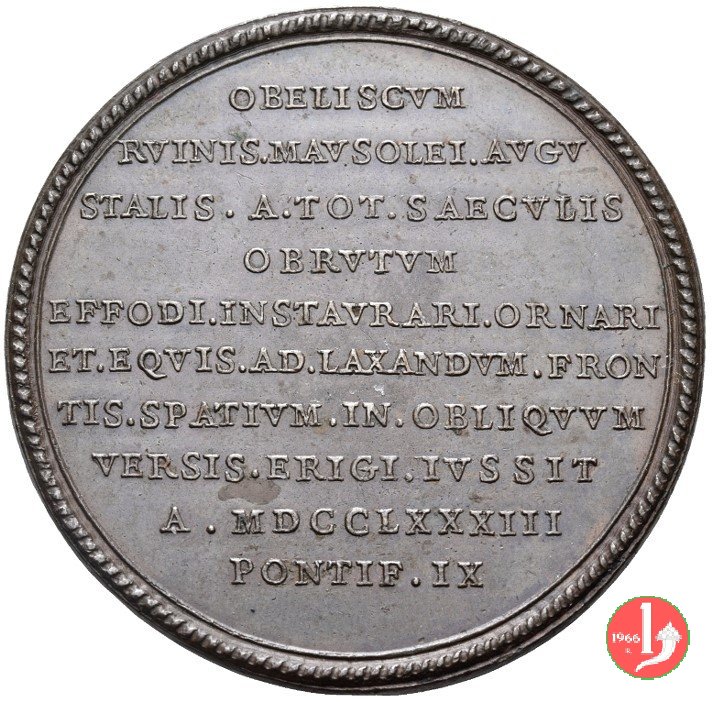 Verso: OBELISCVM = RVINIS • MAVSOLEI , AVGV = STALIS • A • TOT • SAECVLIS = OBRVTVM = EFFODI • INSTAVRARI • ORNARI = ET • EQVIS • AD • LAXANDVM • FRON = TIS • SPATIVM • IN • OBLIQVVM = VERSIS • ERIGI • IVSSIT = A • MDCCLXXXIII = PONTIF • IX