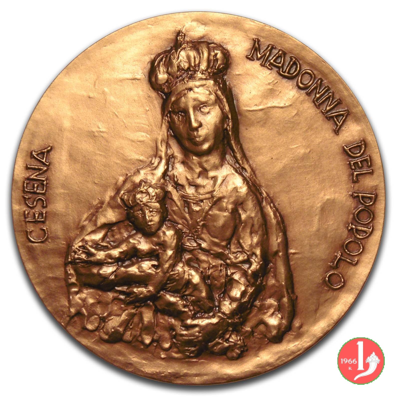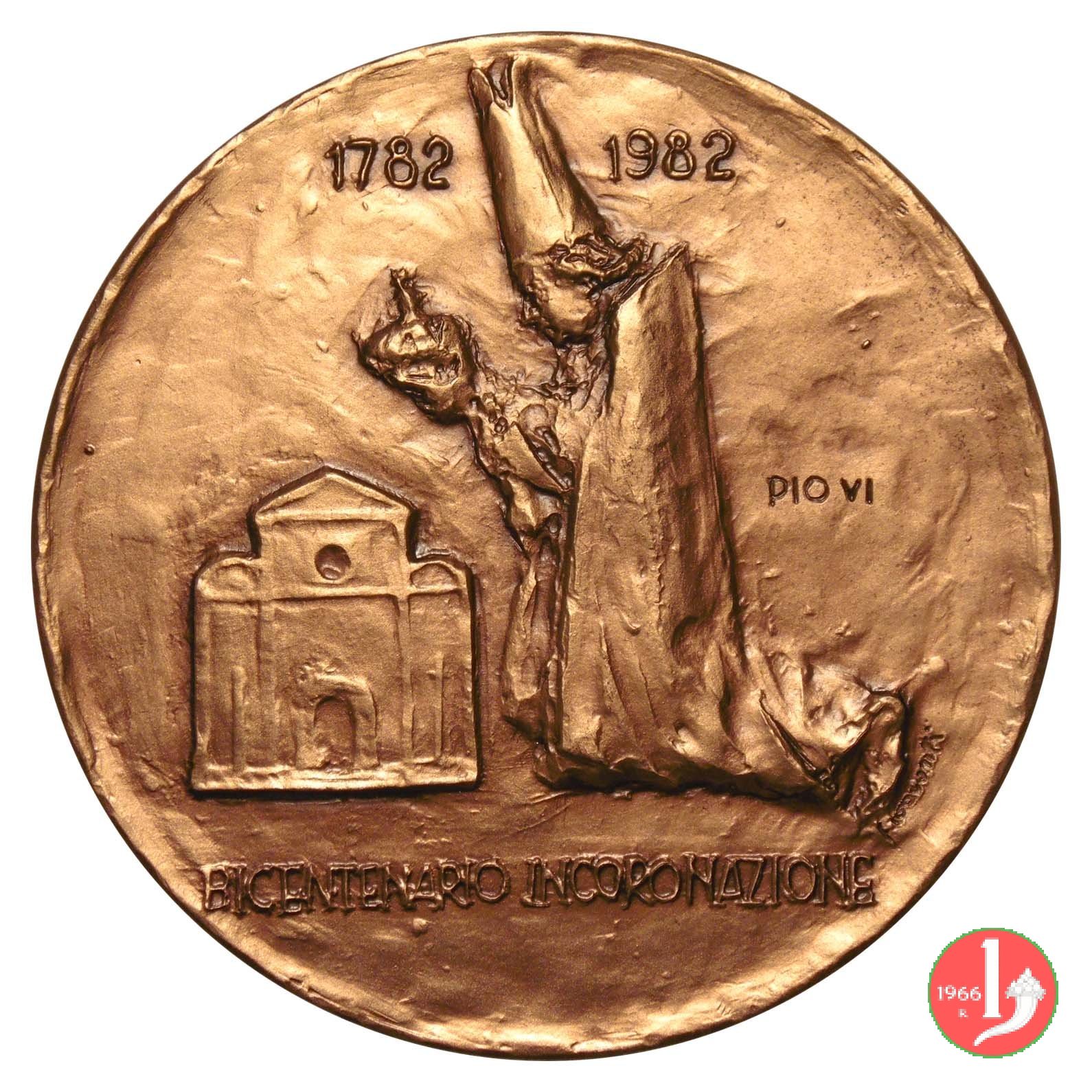 200° Incoronazione Madonna del Popolo 1982 Dritto: in alto: 1782 _ 1982 Papa Pio VI con mitra e piviale, genuflesso verso sx, imporne corona sul prospetto anteriore del Santuario in Cesena nel campo a dx: PIO VI in esergo: BICENTENARIO INCORONAZIONE in basso, a dx: FIORAVANTI busto della B. V. Maria coronata e velata che regge Bambino | |