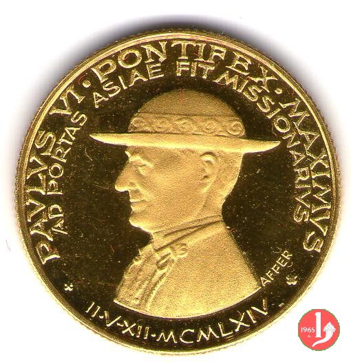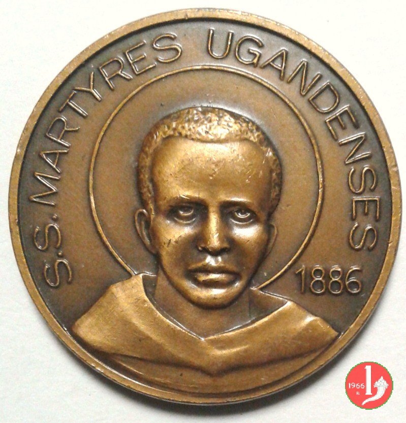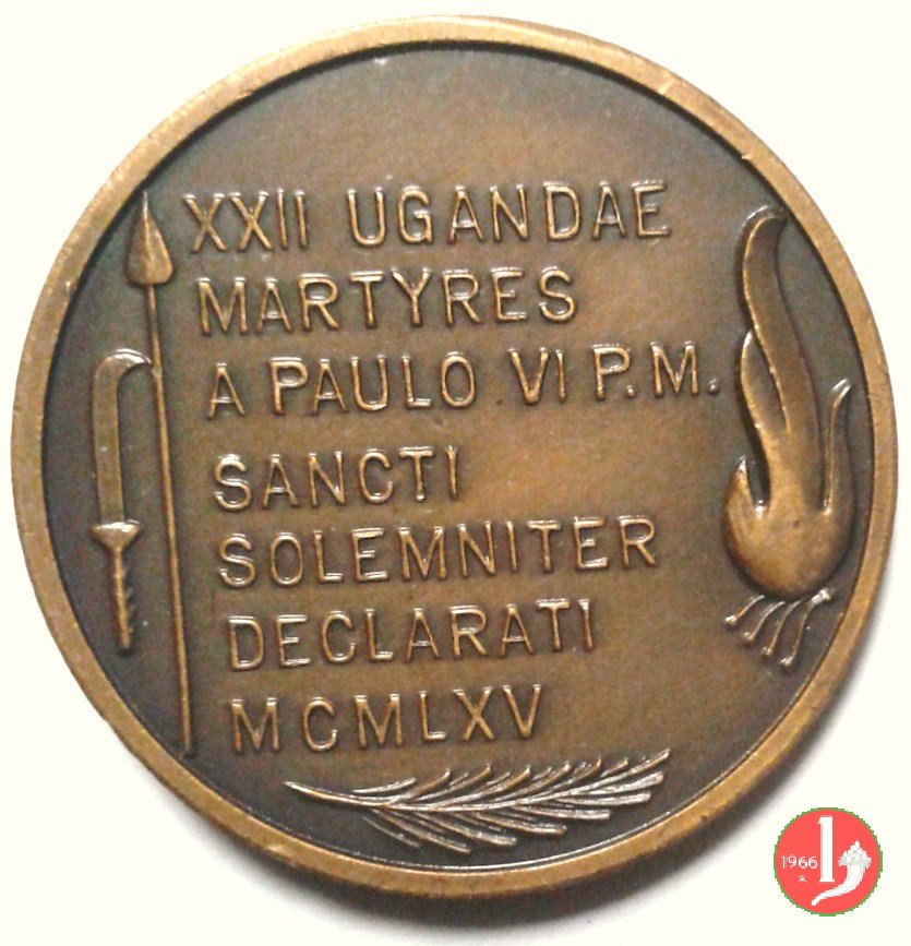 Verso: nel campo tra falce, lancia e fiamma ardente: XXII UGANDAE = MARTYRES = A PAULO VI P.M. = SANCTI = SOLEMNITER = DECLARATI = MCMLXV