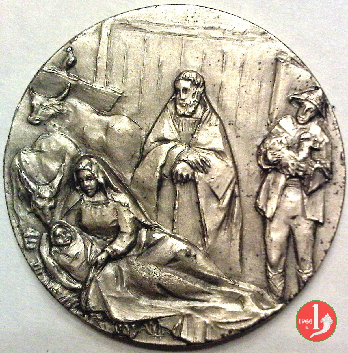 Placchetta Natale 1968 -C80 Dritto: entro trifora: l'Annunciazione, la Nascita di Gesú, la Fuga in Egitto in basso, a dx: E. MANFRINI in esergo: PAX HOMINIBUS BONAE VOLUNTATIS sulla base di dx: 68 | |