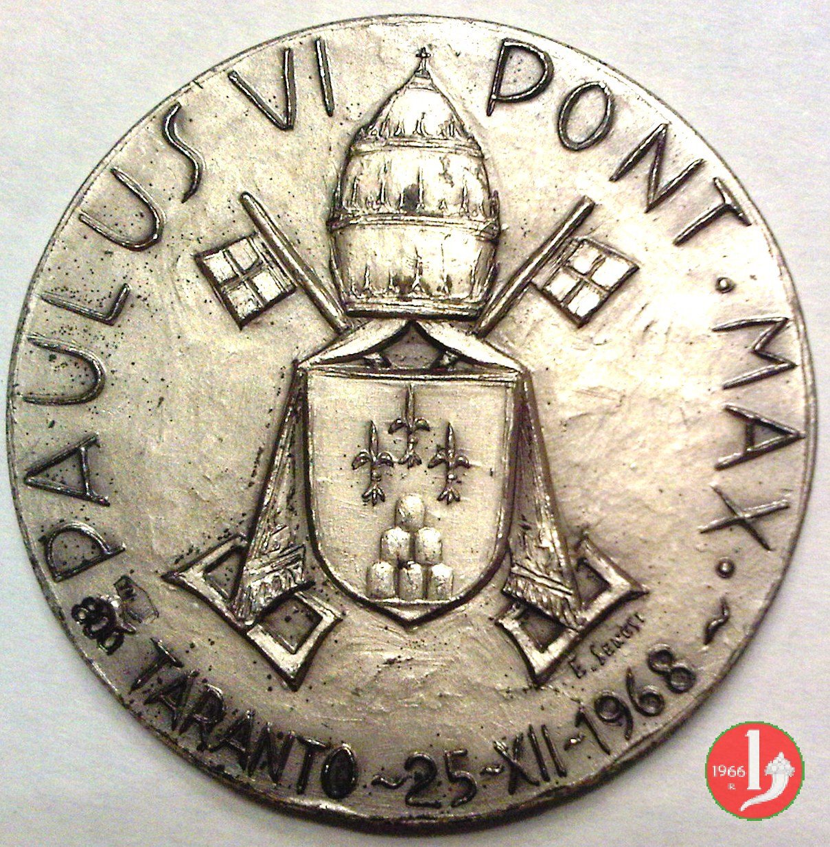 Natale a Taranto 1968 -MM250 Dritto: PAULUS VI _ PONT • MAX • = TARANTO • 25 • XII • 1968 Stemma Papale su chiavi decussate coronato da triregno in basso a dx: E.SENESI | |