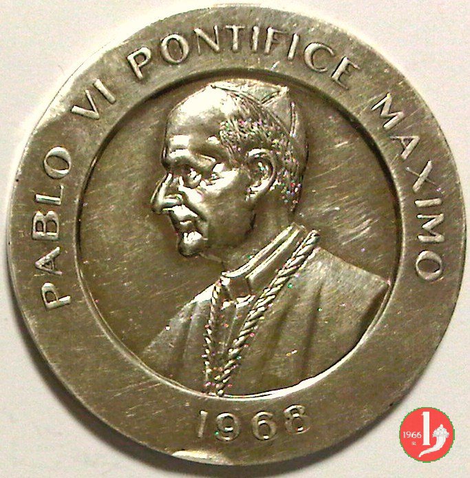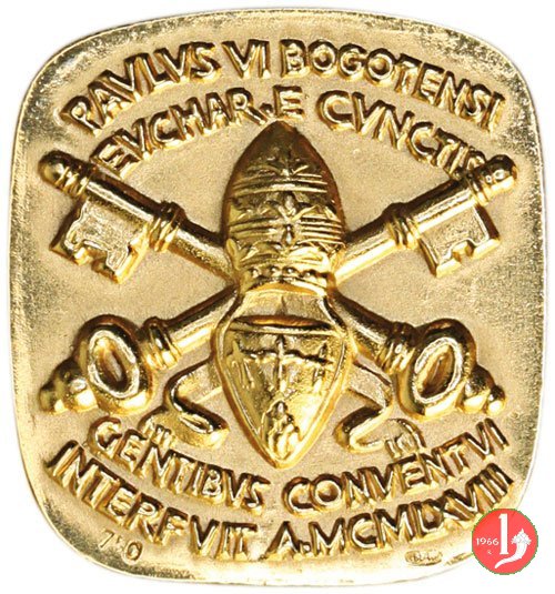 Viaggio a Bogotà 22-08-1968 Dritto: S. S. PAULO VI busto di 3/4 a dx con berretto e veste talare sotto: CYS Croce con stella raggiante sul globo nel campo, a dx: A e A specchiata in basso: 1968 | |