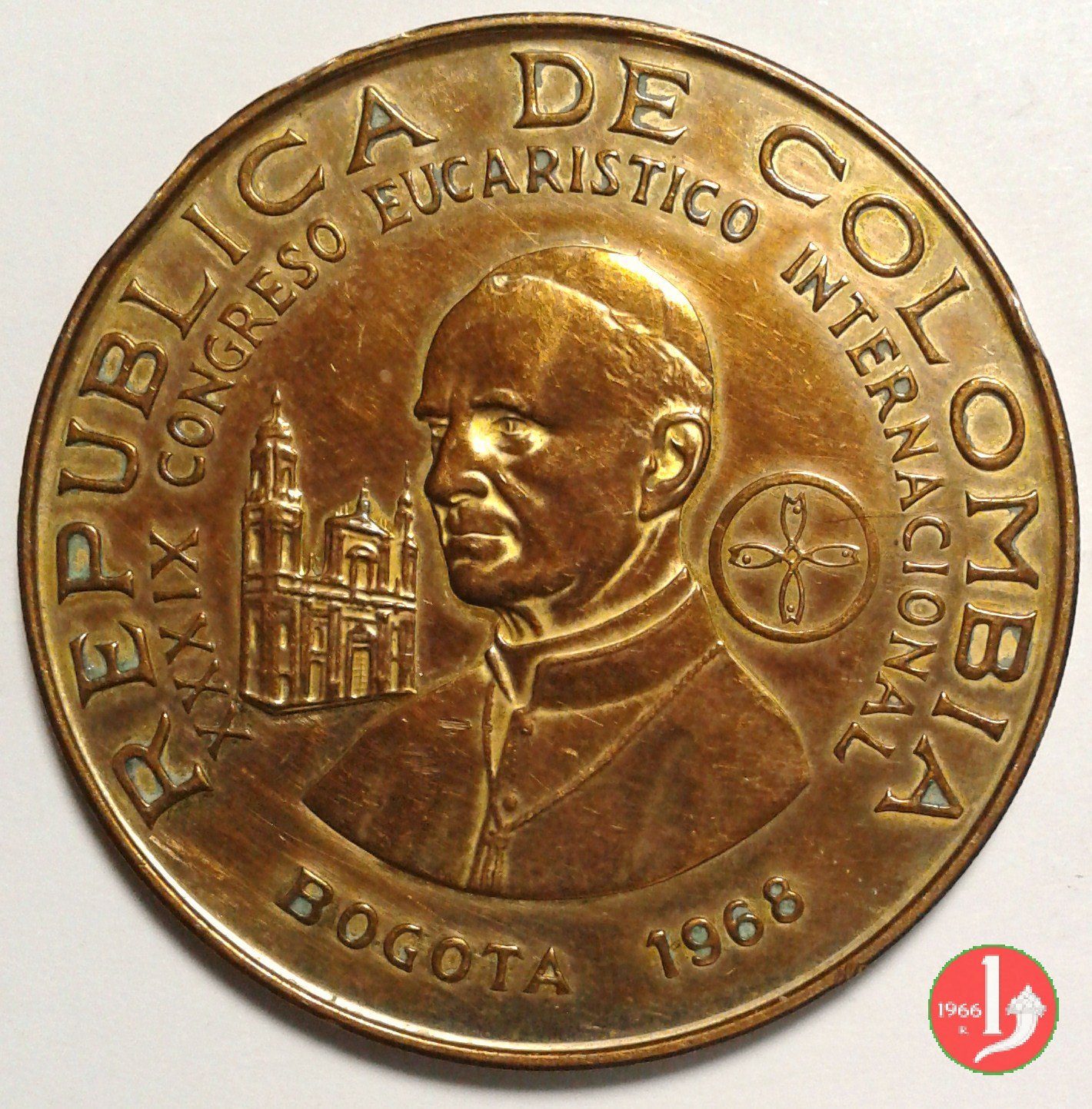 Viaggio a Bogotà - Uniface 22-08-1968 Dritto: REPUBBLICA DE COLOMBIA = XXIX CONGRESO EUCARISTICO INTERNACIONAL busto di 3/4 a sx con berretto, veste talare e Croce pettorale ai lati: vista della facciata del Duomo di Bogotà e logo del Congresso Eucaristico sotto: BOGOTA 1968 | |