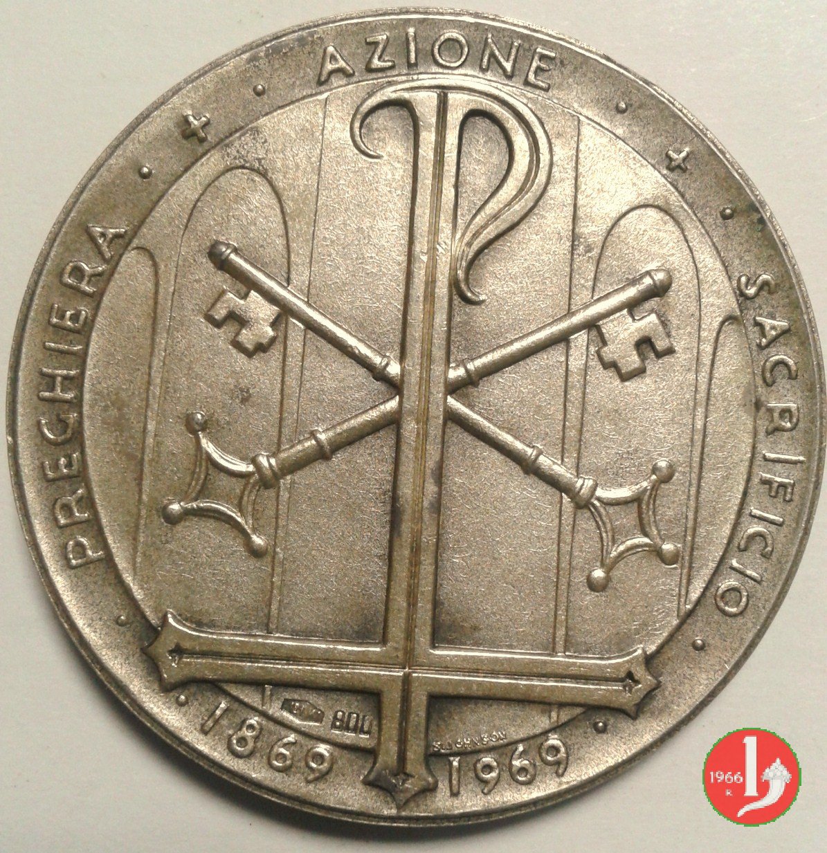 100° Circolo San Pietro a Roma 28-04-1969 -MM253 Dritto: PRIMO • CENTENARIO • FONDAZIONE • CIRCOLO • S. PIETRO • IN • ROMA busti accollati a sx, abiti talari di Pio IX con berretto, mozzetta e stola e di Paolo VI con berretto, abito talare e Croce pettorale (catena) nel campo, a dx: OPVS = PIRRONE = ROMA = 69 Croce rovesciata su chiavi decussate, entro sfondo ad arcate sotto: • 1869 _ 1969 • in basso,a dx: S. JOHNSON | |