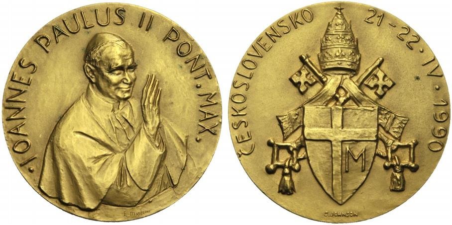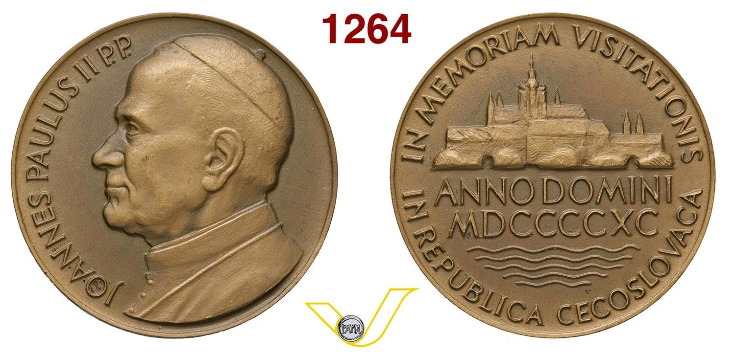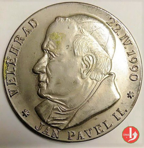 Visita in Cecoslovacchia 21-04-1990 Dritto: • IOANNES PAULUS II PONT. MAX. busto benedicente di 3/4 a dx con berretto, veste talare e mantellina in basso: E. MANFRINI Stemma Papale su chiavi coronato da triregno sotto: S • JOHNSON | |