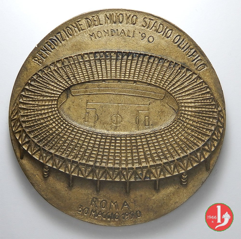 Benedizione Stadio Olimpico Roma 30-05-1990 Dritto: IOANNES PAOLUS II _ PONT. MAX. AN. XII busto a dx con zucchetto, mozzetta d'ermellino e stola sotto: GIANDOMENICO Vista del Nuovo Stadio sotto: ROMA = 30 MAGGIO 1990 | |
