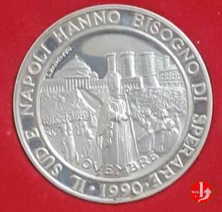 Vita del Papa - Visita a Napoli 1990 Dritto: IL SUD E NAPOLI HANNO BISOGNO DI SPERARE = • 1990 • entro cerchio continuo: Il Papa in piedi con mitra e pastorale tra la folla e sullo sfondo il porticato di Piazza Plebiscito e il maschio Angioino in basso circolarmente presso il bordo interno: NOVEMBRE in alto a sx: L. PANCOTTO Stemma papale su chiavi decussate e coronato da triregno (nell'argento sotto lo stemma il N° dell'esemplare) | |