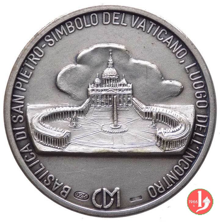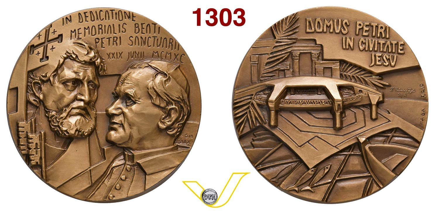 Memoriale di San Pietro a Cafarnao 29-06-1990 Dritto: in alto: IN DEDICATIONE = MEMORIALIS BEATI = PETRI SANCTUARII = XXIX JUNII MCMXC busti affiancati di San Pietro e di Giovanni Paolo II con berretto e veste talare a sx: chiavi verticali a dx, dietro la testa: F. GIO = MABA vista del fabbricato tra rami di palma in basso: pesci e prua di barca a dx: MABA _ F. GIO nel campo a dx: D. COLOMBO E FIGLI | |