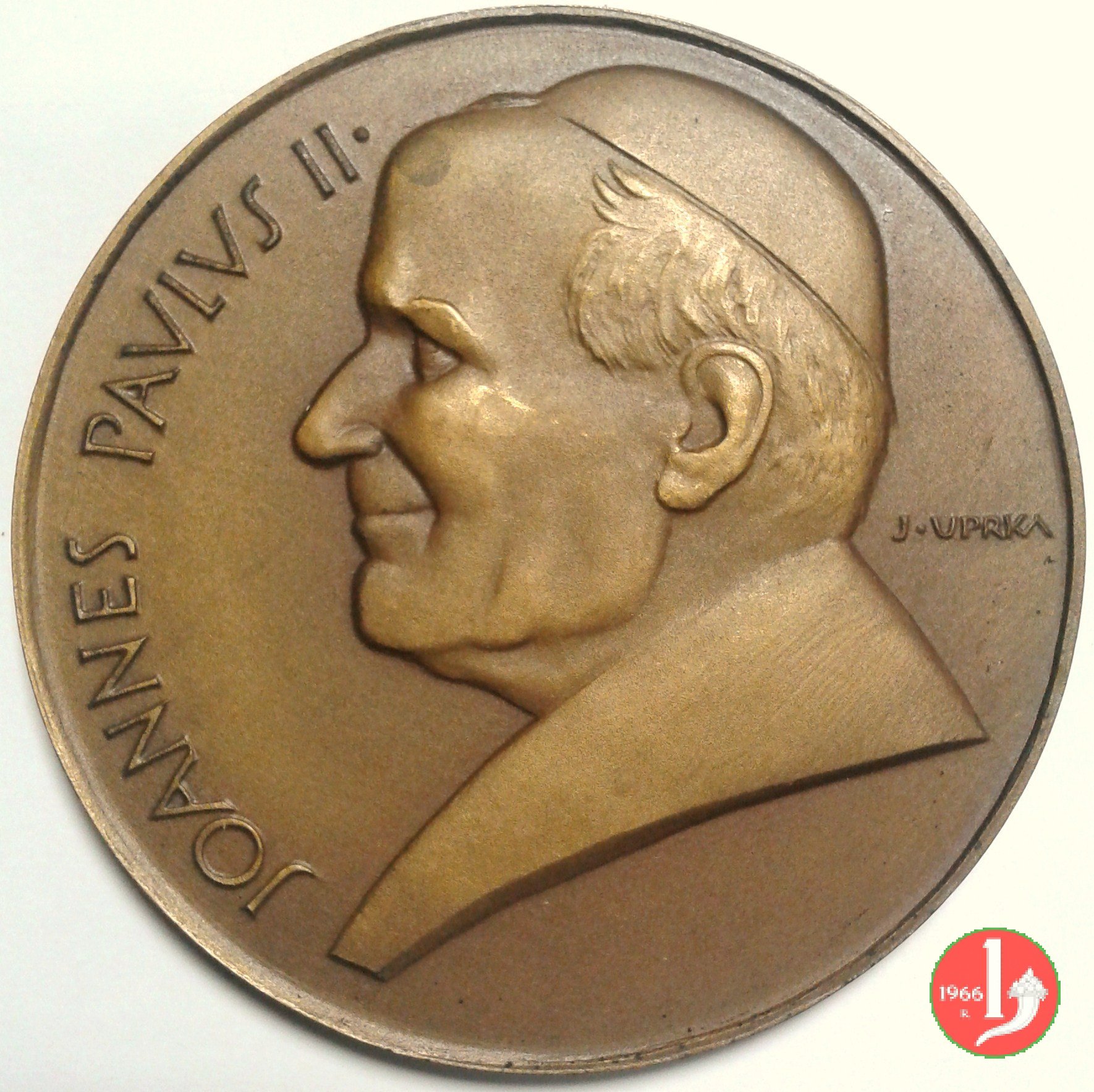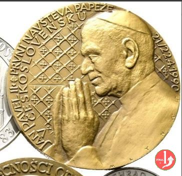 Visita in Cecoslovacchia 21-04-1990 Dritto: IOANNES • PAULUS • II = * PONTIFEX • MAXIMUS * busto a sx con berretto e piviale tre monumenti delle Città toccate dalla visita irraggiate dal triangolo Divino in basso: REDOS | |