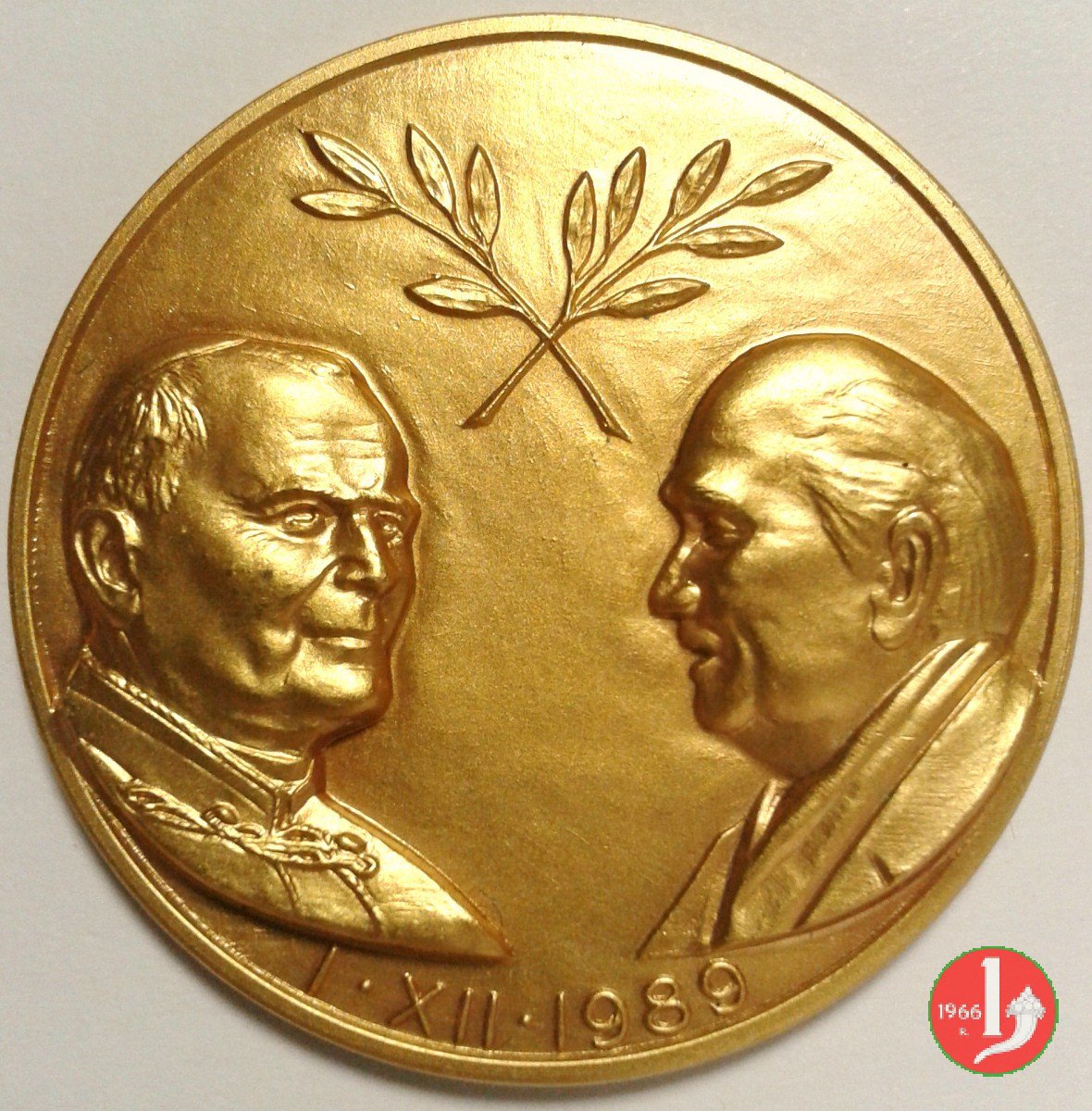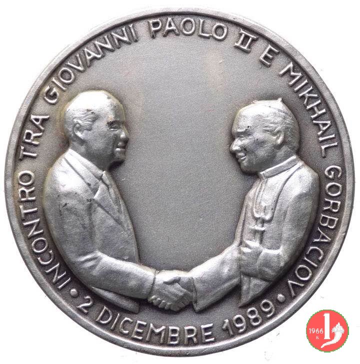 Incontro con Gorbaciov 01-12-1989 Dritto: busti affrontati di Giovanni Paolo II con berretto, abito talare e mantellina e di Michail Gorbaciov con al centro, in alto, rami d'ulivo decussati in basso: I • XII • 1989 in basso: ROMA | |