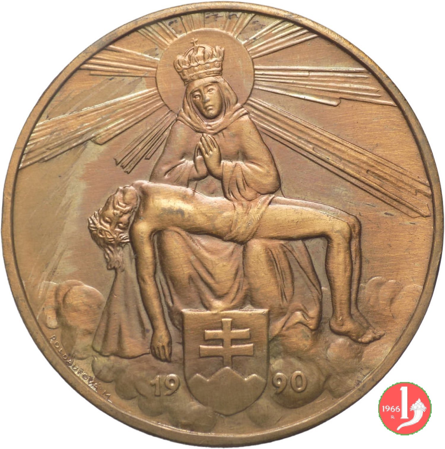 Viaggio in Slovacchia 21-04-1990 Dritto: NAVSTEVA SVATEHO OTCA JANA PAVLA II. NA SLOVENSKU - APRIL 1990 ✠ busto a dx con berretto, pianeta e pallio entro arco decorato, sostenuto da colonne tortili La B. V. dei sette dolori sotto: ORODUIZ ZA NAS | |