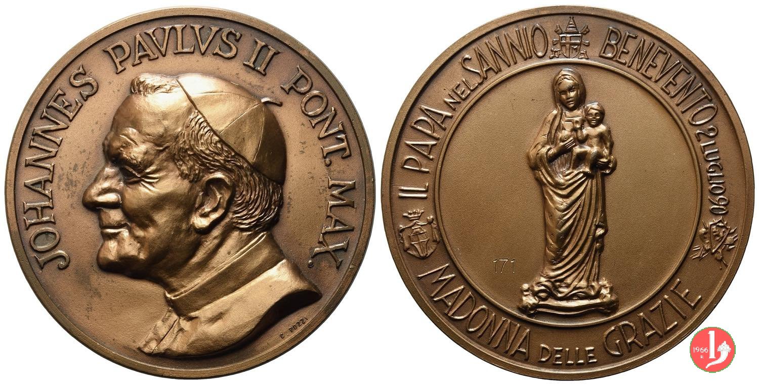Visita nel Sannio a Benevento 02-07-1990 Dritto: JOHANNES PAVLVS II PONT. MAX. busto a sx con zucchetto e abito talare sotto: C. POZZI entro cornice circolare continua: La Madonna delle Grazie drappeggiata e di fronte regge il Bambino Gesú | |