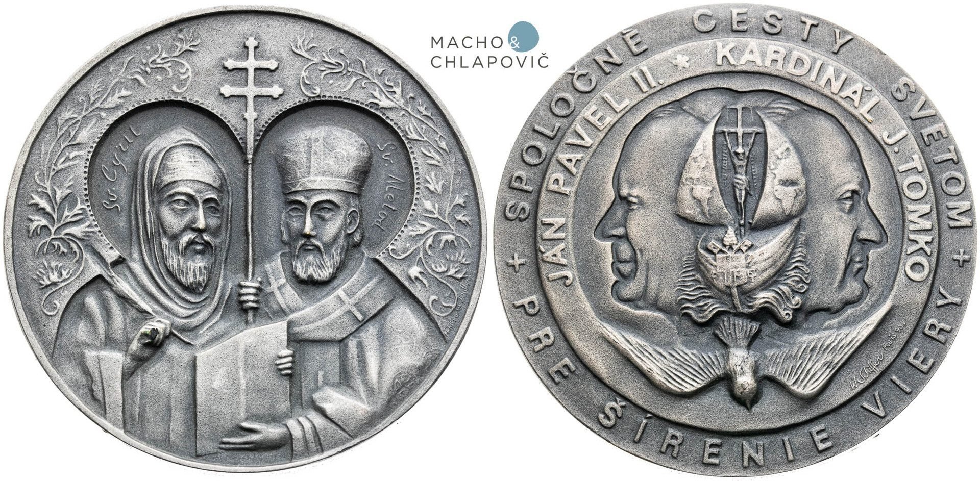 Viaggio in Slovacchia 21-04-1990 Dritto: ✠ SPOLOGNE' CESTY SVETOM ✠ = PRE SIRENIE VIERY Profili contrapposti di Giovanni Paolo II e del Cardinal Tomko con al centro barca a vela recante lo Stemma Papale e il Crocefisso, attorno: JAN PAWEL II * CARDINAL J. TOMKO sotto: colomba ad ali spiegate in basso a dx: W. Schiffer Paris 90. in alto: rami d'acanto | |