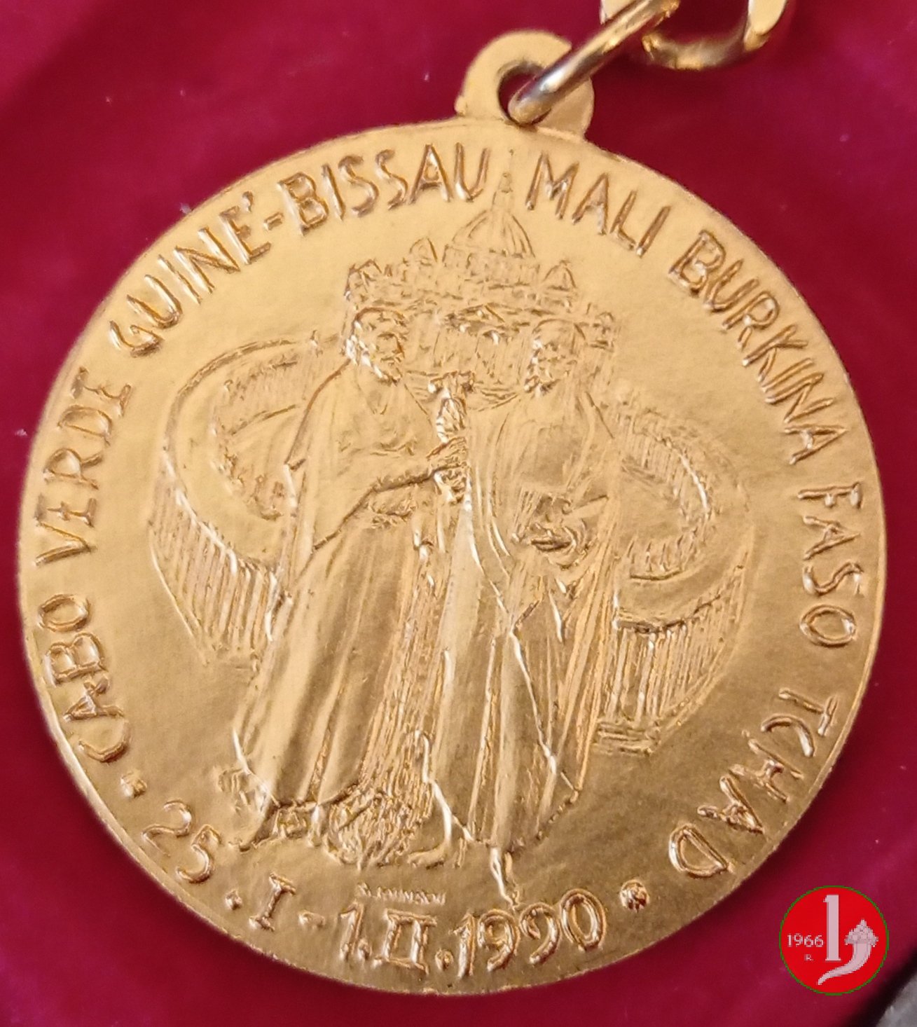 Viaggio a Capo Verde-Guinea-Mali-Ciad 25-01-90 Dritto: • IOANNES PAULUS II PONT. MAX. busto benedicente di 3/4 a dx con berretto e cappa sotto: E. MANFRINI Gesú consegna le chiavi a S. Pietro, sullo sfondo Piazza San Pietro sotto: S. JOHNSON | |