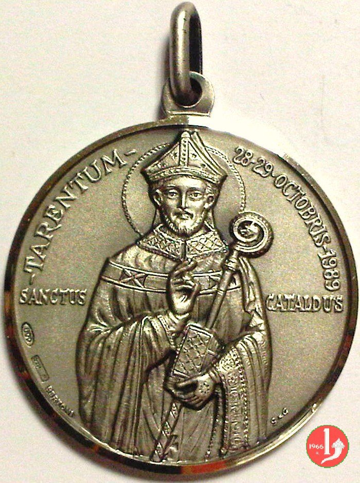 Visita a Taranto 28-10-1989 Dritto: IOANNES • PAVLVS • II • _ PONTIFEX • MAXIMVS busto a sx con berretto, mozzetta e stola sotto:S • GAZZANIGA busto nimbato di fronte di San Cataldo ai lati: SANCTUS _ CATALDUS in basso a sx: BERTONI in basso a dx: S*G | |