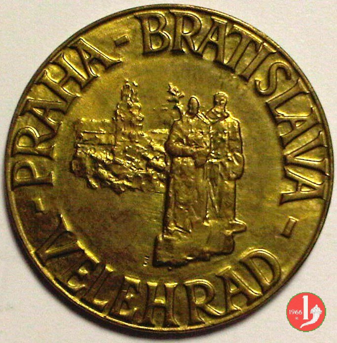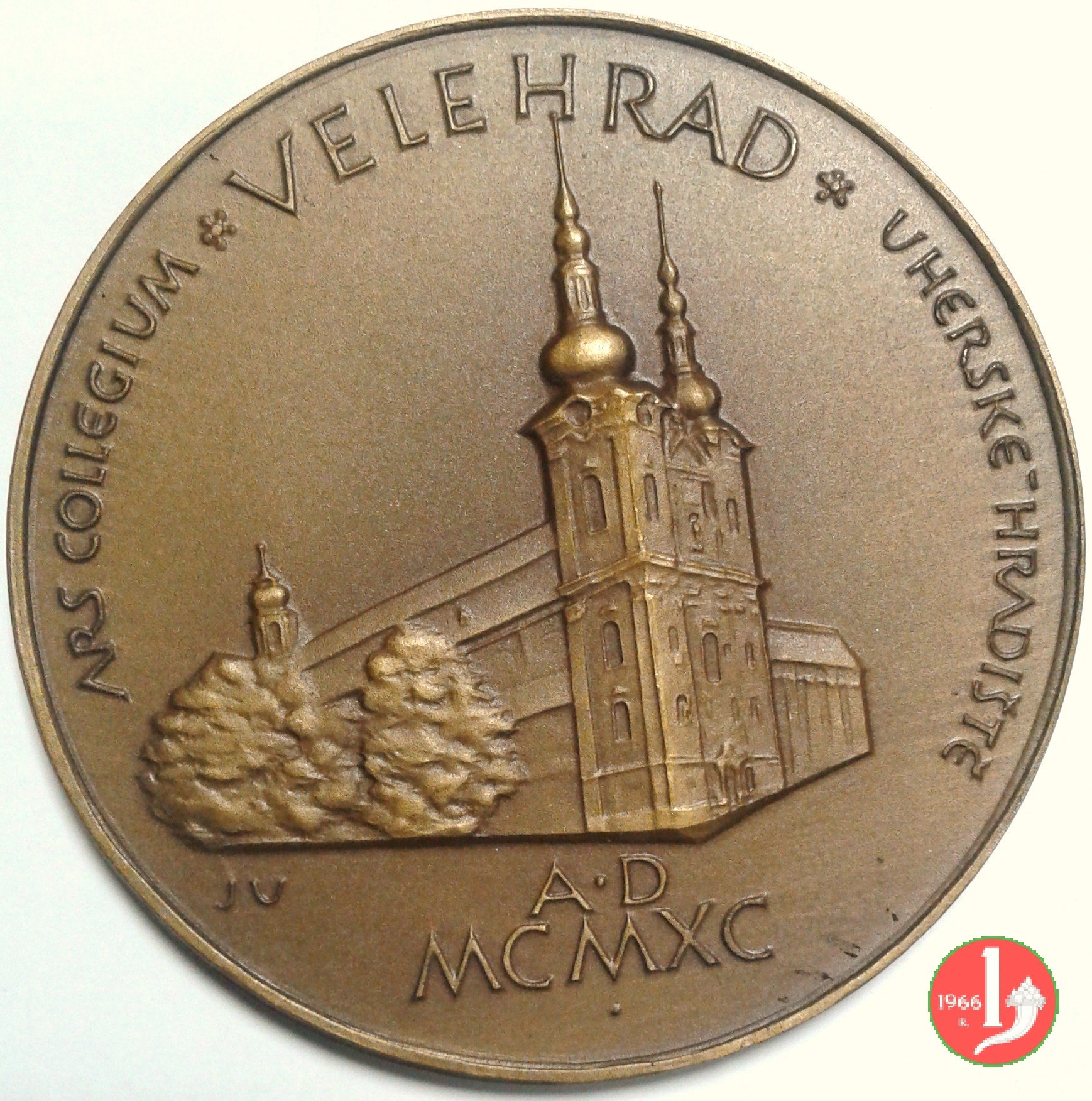 Visita a Velehrad 22-04-1990 Dritto: busto benedicente di 3/4 a sx con mitra, pianeta, pallio e pastorale in alto, a sx: PP • = JOANNES = PAULUS II • Prospetto anteriore della Basilica di San Cirillo, bordata ai lati e in basso da nastro con l'iscrizione: ✠ VELEHRAD ✠ attorno: 8 stelle | |