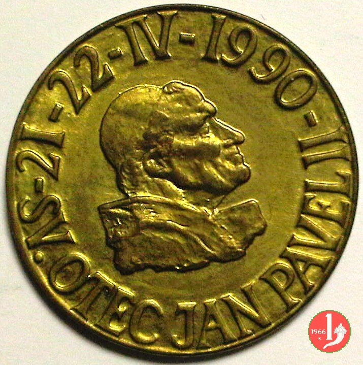 Visita in Cecoslovacchia 21-04-1990 Dritto: JOANNES PAULUS II P.P. busto a sx con berretto e veste talare e Croce pettorale (catena) Vista del profilo di Città con sotto onde sotto: ANNO DOMINI = MDCCCCXC | |