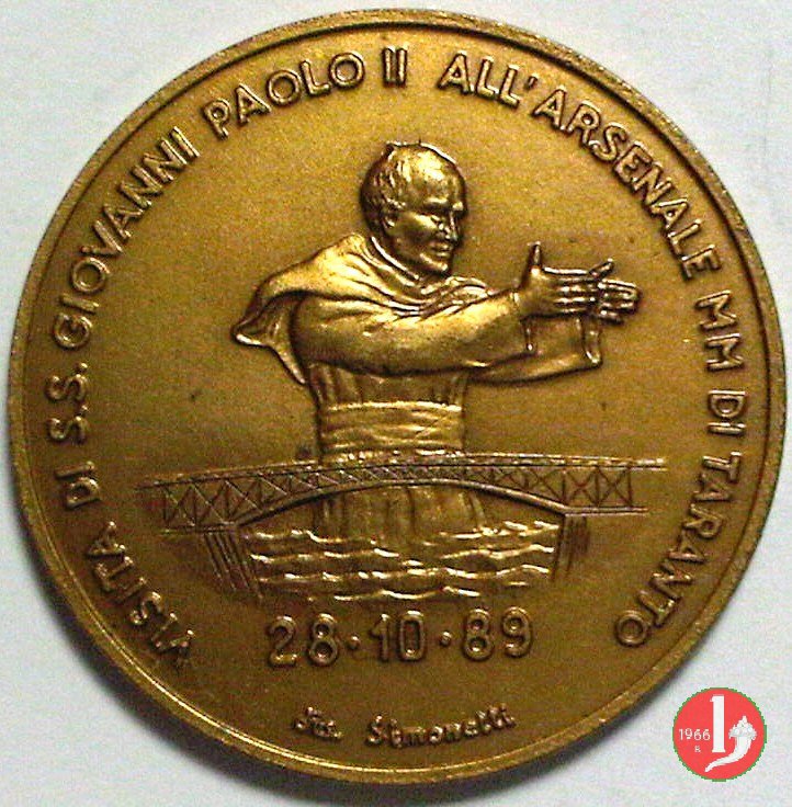 Visita all'Arsenale di Taranto 28-10-89 Dritto: VISITA DI S.S. GIOVANNI PAOLO II ALL'ARSENALE MM DI TARANTO busto a dx con berretto, mantellina e veste talare, con mani protese a dx, su ponte a struttura reticolare sotto: 28 • 10 • 89 in basso: DIS. SIMONETTI in basso: G. MINASSI | |