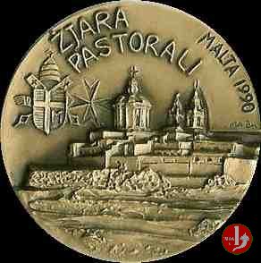 Viaggio a Malta 25-05-1990 Dritto: JOANNES PAULUS II PONT • = MAX • busto a sx con mitra, pastorale e pallio in alto a dx: MALTA 1990 Veduta de La Valletta a sx: Stemma Papale e Croce di Malta affiancati a dx: MABA | |