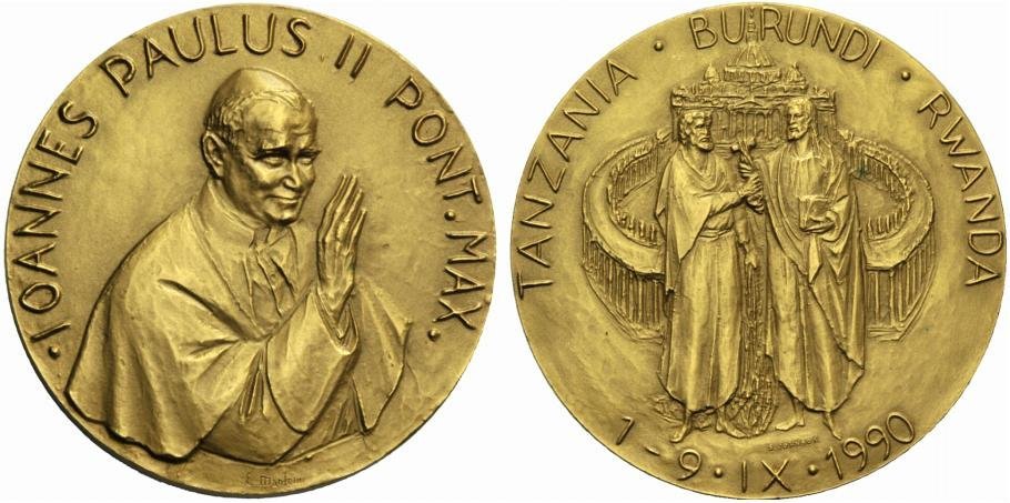 70° Compleanno 18-05-1990 Dritto: Anepigrafe busto orante a dx con berretto, pianeta e pallio in basso,a dx, sulla spalla, monogramma: KJ Stemma Papale su chiavi decussate e coronato da triregno | |