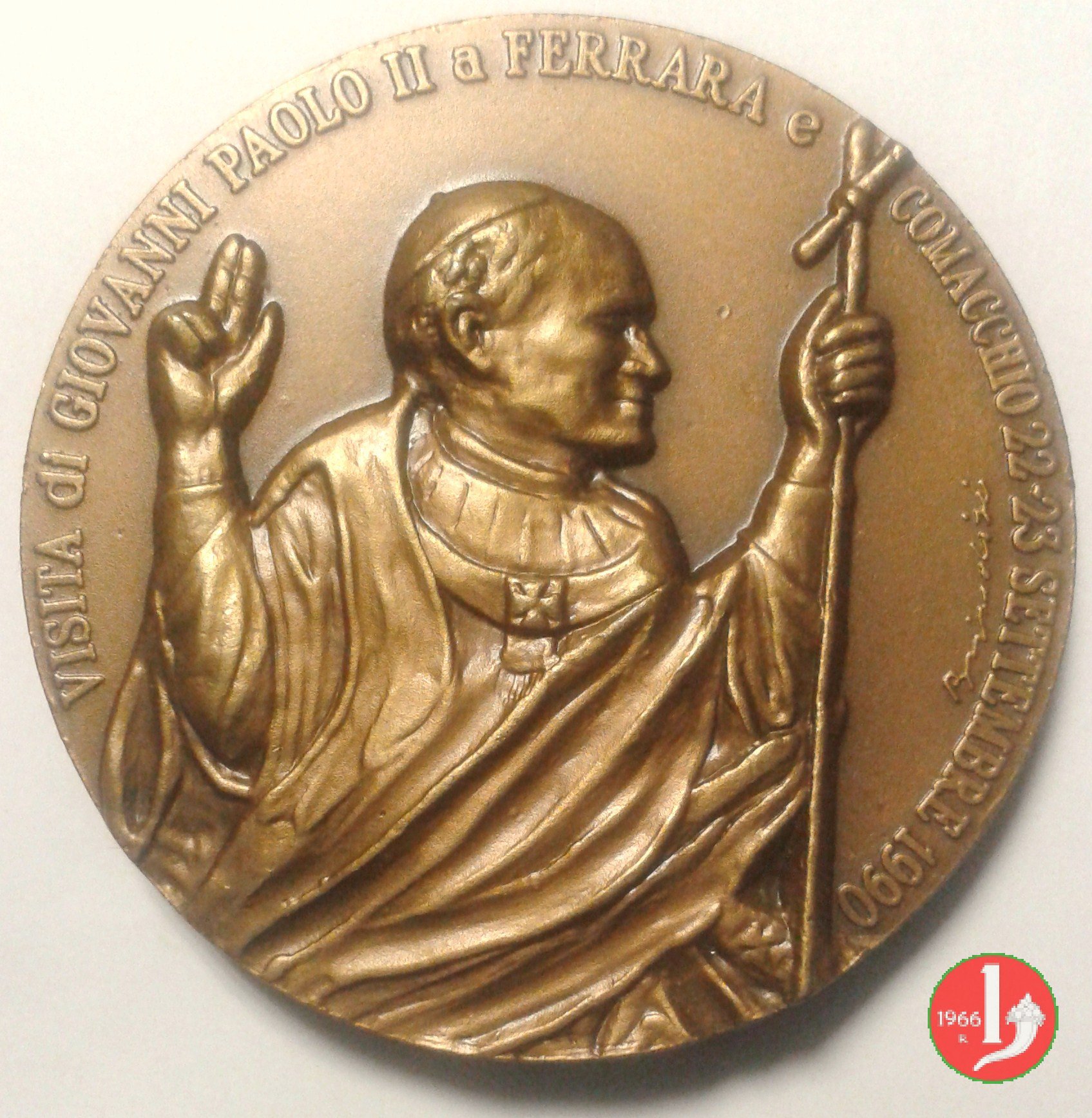 Visita a Ferrara e Comacchio 22-09-1990 Dritto: VISITA DI GIOVANNI PAOLO II A FERRARA E _ COMACCHIO 22-23 SETTEMBRE 1990 busto benedicente a dx con berretto, pallio e pastorale a dx e corsivo: BRINDISI in basso: il Duomo di Ferrara | |