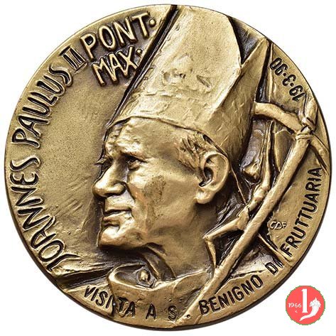 Visita a S. Benigno Canavese 19-03-1990 Dritto: JOANNES PAULUS II PONT • = MAX • busto a sx con mitra, pallio e pastorale in basso: VISITA A S. BENIGNO DI FRUTTUARIA _ 19 • 3 • 90 nel campo a dx: CDF in basso: MABA | |