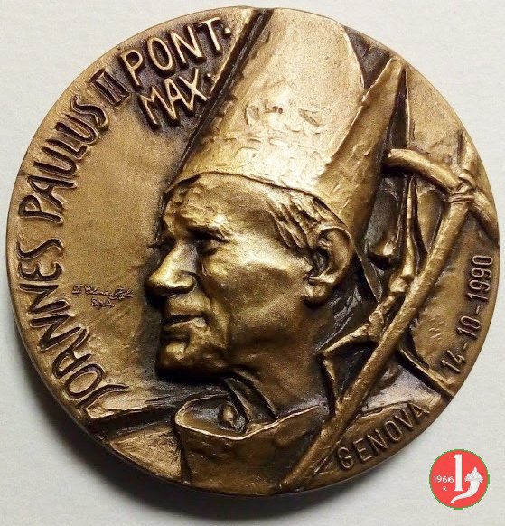 Visita a Genova 14-10-1990 Dritto: JOANNES PAULUS II PONT • = MAX • busto con mitra e pastorale a sx sotto: GENOVA _ 14-10-1990 nel campo, a sx: D. COLOMBO E FIGLI = S.P.A. L'immagine della B. V. Maria (col titolo di Madonna della Guardia), nimbata, di fronte, col Bambino tra due pecore e pastore genuflesso | |