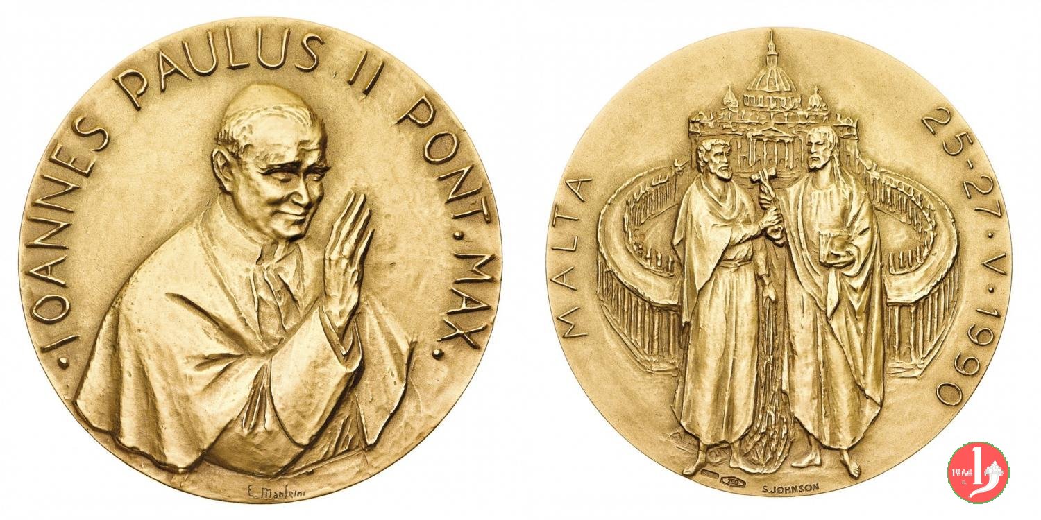 Viaggio a Malta 25-05-1990 Dritto: _ • IOANNES PAULUS II PONT. MAX. busto benedicente di 3/4, a dx con berretto e cappa sotto: E. MANFRINI Gesú consegna le chiavi a S. Pietro davanti a Piazza San Pietro sotto: S. JOHNSON | |
