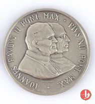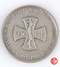 50° Associazione Medici Cattolici Italiani 05-07-1994 Dritto: IOANNES PAVLVS II PONT. MAX. • PIVS XII PONT. MAX. ✠ busti accollati a dx dei due pontefici con zucchetti, abiti talari e Croci pettorali (catene) Logo con caduceo su Croce rinforzata in campo a losanghe crociate | |