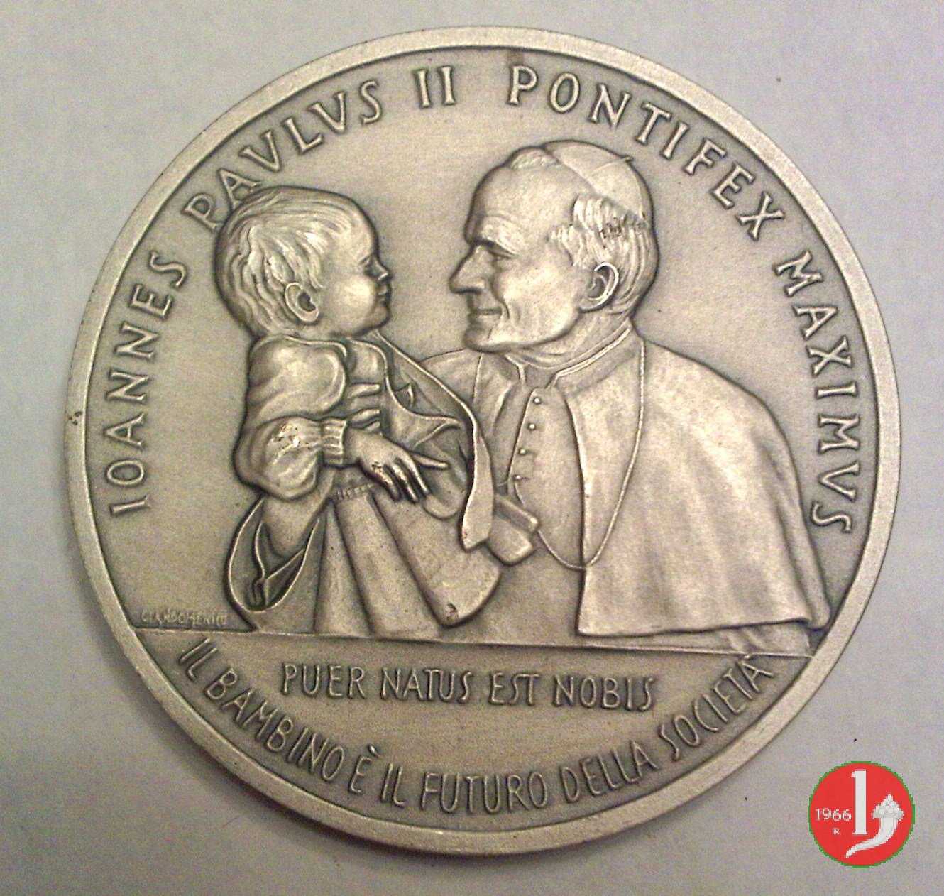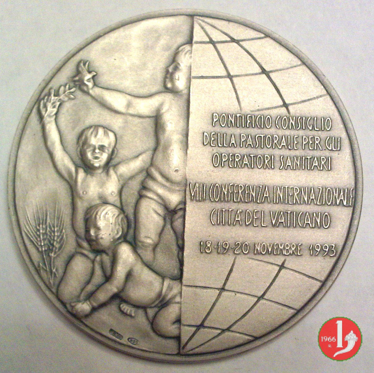 Pontificio Consiglio Operatori Sanitari VIII Conf. Int. 18-11-93 Dritto: Campo diviso verticalmente in due: a sx: bambini al gioco a dx in porzione di emisfero: PONTIFICIO CONSIGLIO = PER LA PASTORALE DEGLI = OPERATORI SANITARI = VIII CONFERENZA INTERNAZIONALE = CITTA' DEL VATICANO = 18-19-20 NOVEMBRE 1993 busto con neonato in braccio, volto a sx in esergo: PUER NATUS EST NOBIS = IL BAMBINO E' IL FUTURO DELLA SOCIETA' sopra la linea dell'esergo, a sx: GIANDOMENICO | |