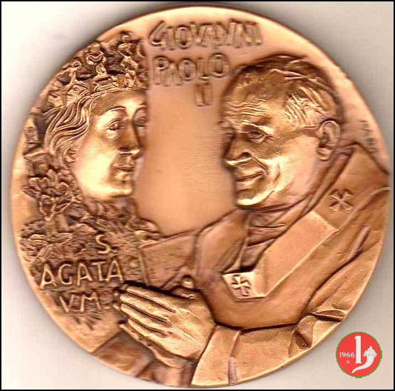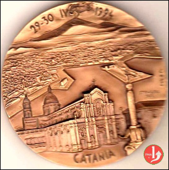 Visita rinviata a Catania 29-04-1994 Dritto: in alto: GIOVANNI = PAOLO = II busti affrontati di Sant'Agata coronata e del Papa orante con berretto e pallio in basso, a sx: S. = AGATA = V.M. sotto, a sx: CDF a dx, presso il bordo: MA BA Panorama della Città dal Porto e vista del Duomo di Sant'Agata nel campo, a dx: D. COLOMBO & = FIGLI SNC a dx, presso il bordo: MA BA in esergo: CATANIA | |