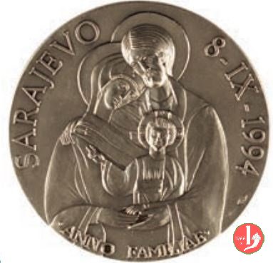 Visita annullata a Sarajevo 08-09-1994 Dritto: IOANNES PAULUS PP. II busto di 3/4 a sx con berretto, veste talare e Croce pettorale (catena) sulla spalla dx: L. PANCOTTO sotto: S. JOHNSON La Sacra Famiglia nimbata di fronte in basso: • ANNO FAMILIAE • | |