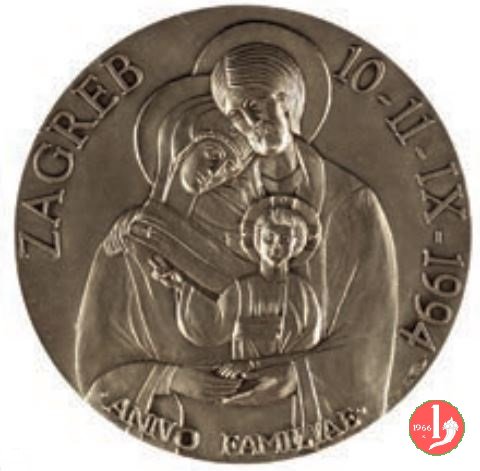 Visita a Zagabria 10-09-1994 Dritto: IOANNES PAULUS PP. II busto di 3/4 a sx con berretto, veste talare e Croce pettorale (catena) sulla spalla dx: L. PANCOTTO sotto: S. JOHNSON La Sacra Famiglia nimbata di fronte in basso: • ANNO FAMILIAE • | |