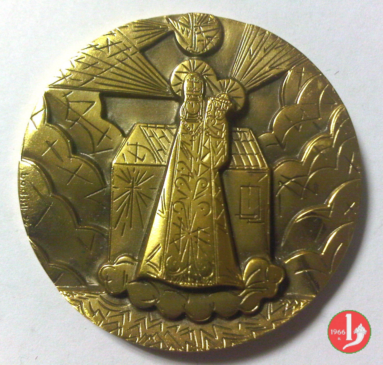 Dritto: L'immagine della Madonna di Loreto col Bambino nimbata e raggiante, in piedi, di fronte, su nube; sullo sfondo la Santa Casa