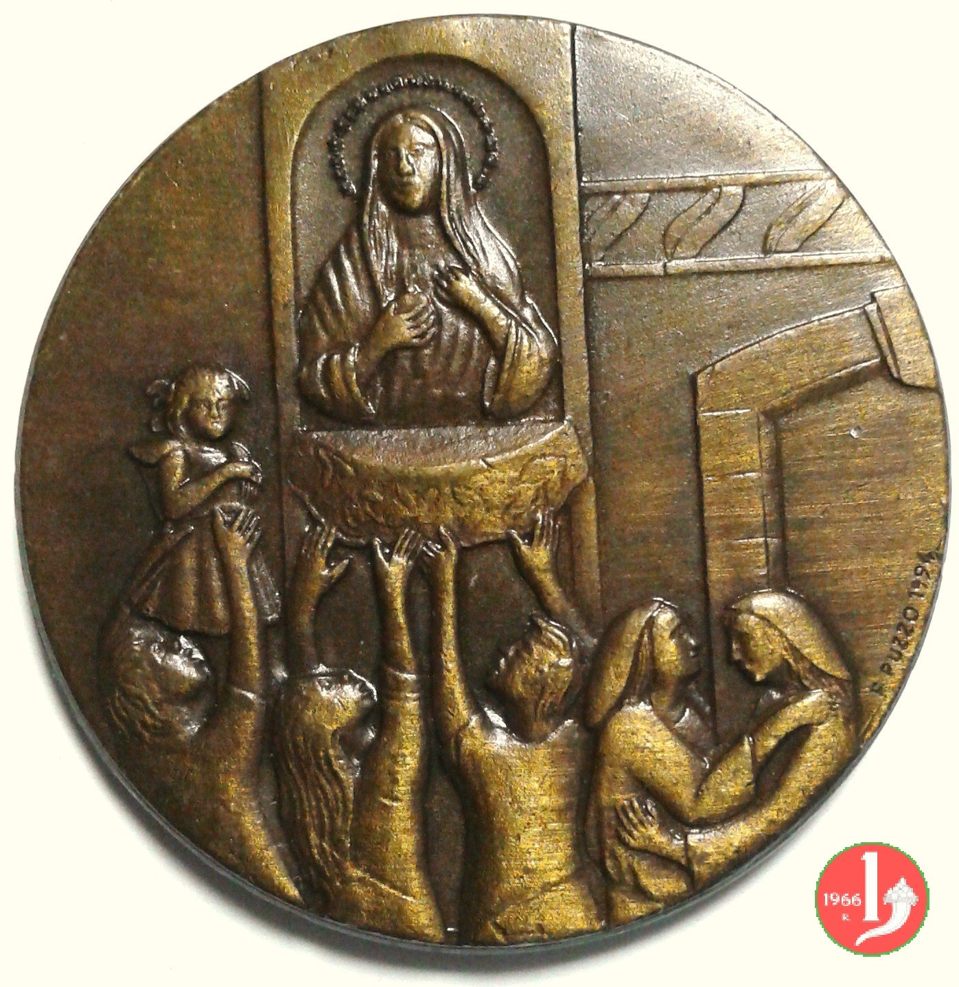 Verso: mani giunte (in preghiera) verso sx in campo lobato, con Croce sullo sfondo